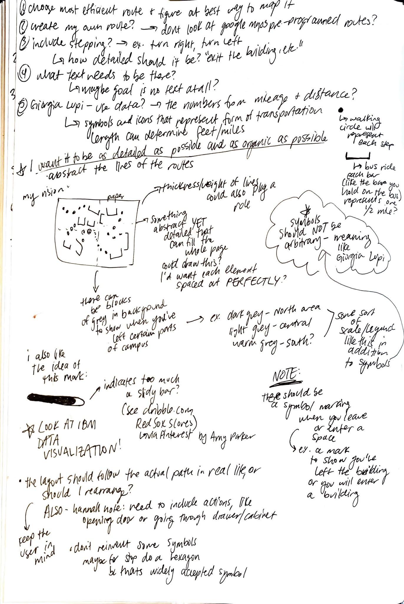 These pages show my sketches and brainstorming for my Toothpaste map (showing how to get from Stamps, Room 2420 to my house/bathroom at 924 Sylvan Ave). The first few pages are my ideas and sketches, working through the route I wanted to go for this map and the different symbols I was planning to use. I also include references in these notes, specifically about Giorgia Lupi’s talk. The last image is the final map I turned in for the assignment.